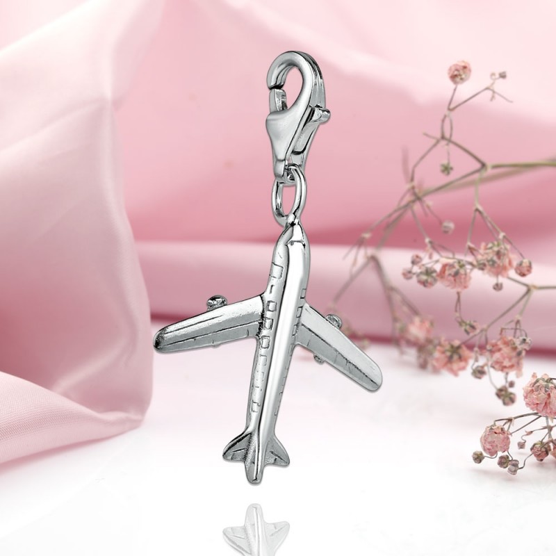 Silberanhänger in Form eines Flugzeuges aus 925er Sterlingsilber, mit Karabiner. Verschluss – Karabiner ermöglicht die Befestigung des Anhängers an Armbändern, Ketten, Ohrringen oder die Verwendung des Anhängers als Schlüsselanhänger. Die Aufhängung ist einseitig, halbvolumetrisch. Überzogen mit Rhodium!