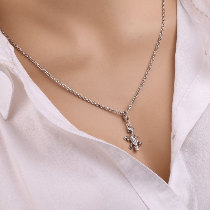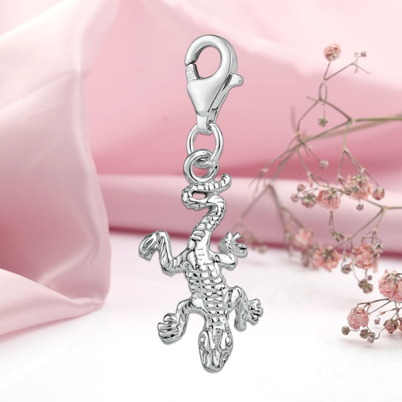 Silberanhänger in Form einer Eidechse aus 925er Sterlingsilber, mit Karabiner. Verschluss – Karabiner ermöglicht die Befestigung des Anhängers an Armbändern, Ketten, Ohrringen oder die Verwendung des Anhängers als Schlüsselanhänger. Die Aufhängung ist einseitig, halbvolumetrisch. Überzogen mit Rhodium!