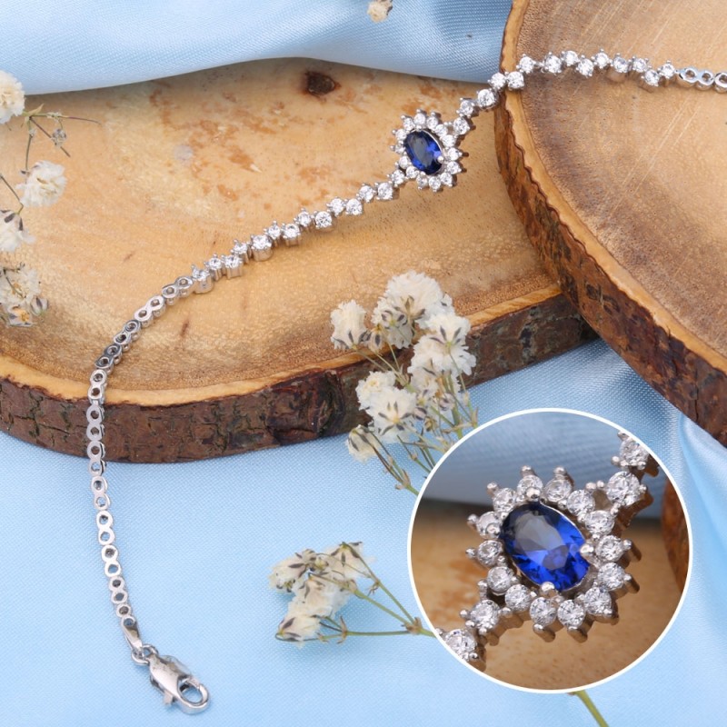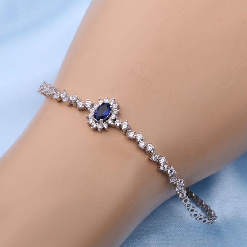 Einsatz: Zirkonia Ø 2,0 mm; 1 ovaler Zirkon in Saphirfarbe 6,0 x 4,0 mm