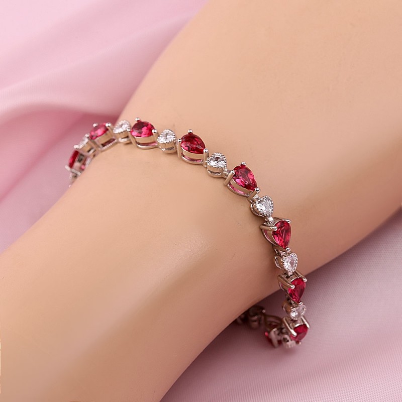 Zartes, feminines Armband aus 925er Sterlingsilber in ausgefallener Flechtung, mit Einsätzen aus funkelnden Zirkonia in ungewöhnlicher Form und bezaubernden Rubelliten! Eine einzigartige Gelegenheit, Ihre Individualität zu betonen, das Bild von Weiblichkeit, Originalität und Zärtlichkeit zu vermitteln.