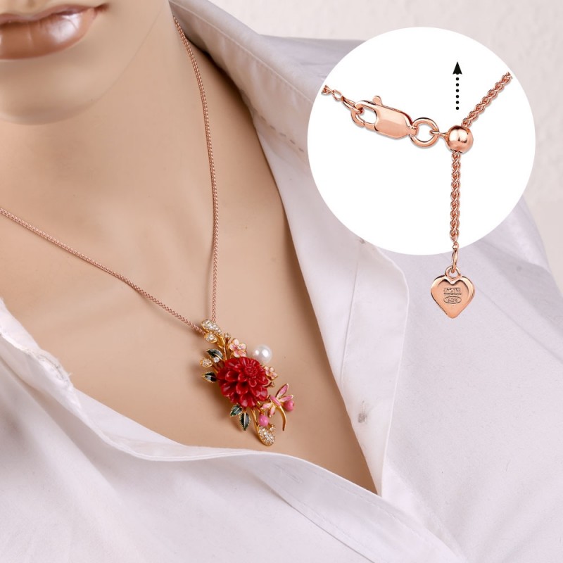 Bezaubernde Halskette aus 925 vergoldetem Silber mit voluminösem, farbenfrohem Anhänger, verziert mit Koralle, Perlen, Zirkonia und Emaille. Kettenweben - „Ähre“. Dank einer speziellen Vorrichtung, einer Verriegelungskugel, ist die Länge der Kette innerhalb der Kettenlänge auf jede beliebige Größe einstellbar! Eine zarte Halskette ergänzt Ihren romantischen Look.