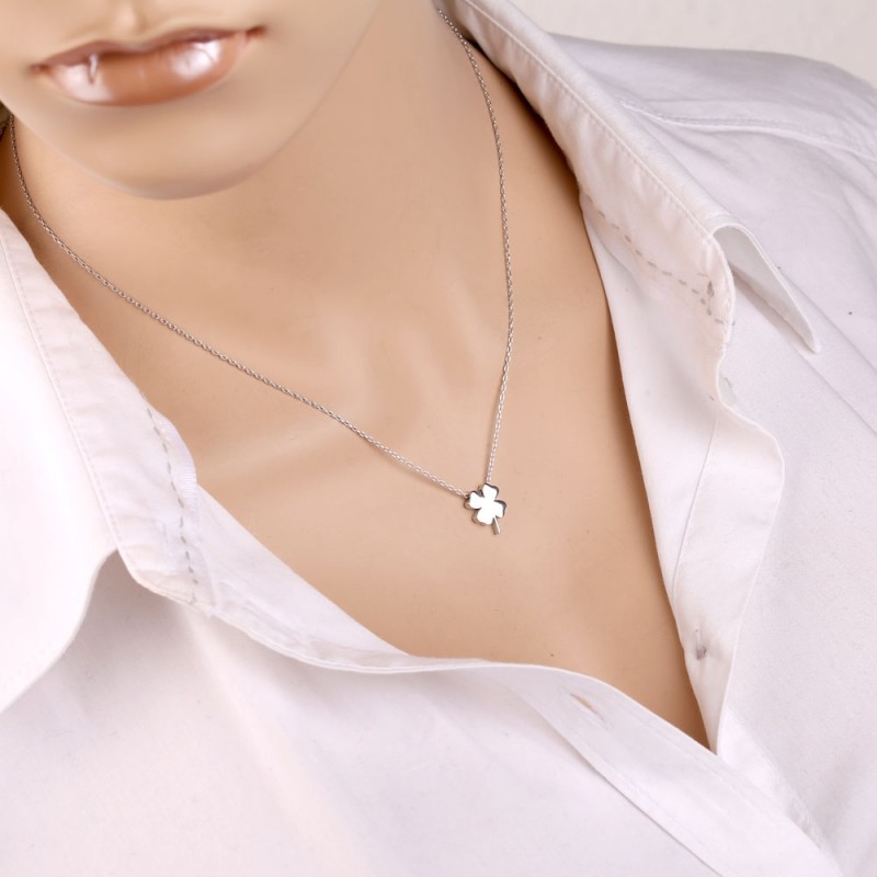 Halskette aus 925er Sterlingsilber mit einem dekorativen volumetrischen Anhänger – einem Schieber in Form eines Kleeblattes. Kettenweberei - Anker, Diamantschliff.