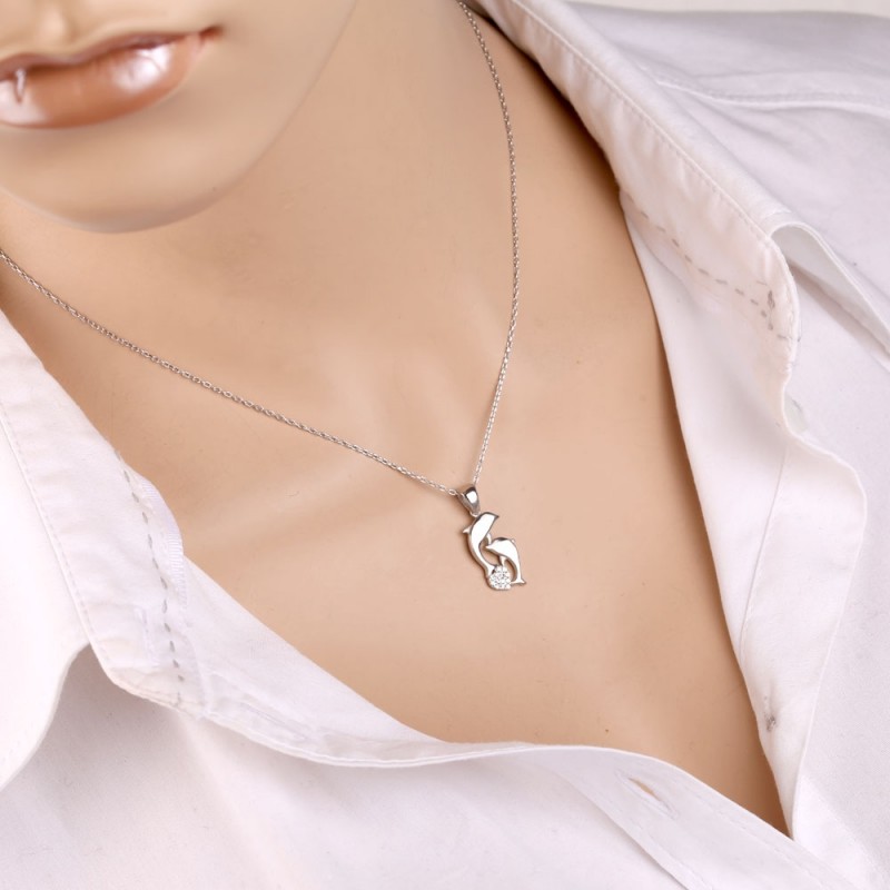 Halskette aus 925er Sterlingsilber mit einem dekorativen Anhänger in Form von einem Delphinenpaar mit Zirkoniaherz. Kettenweberei - Anker, Diamantschliff.