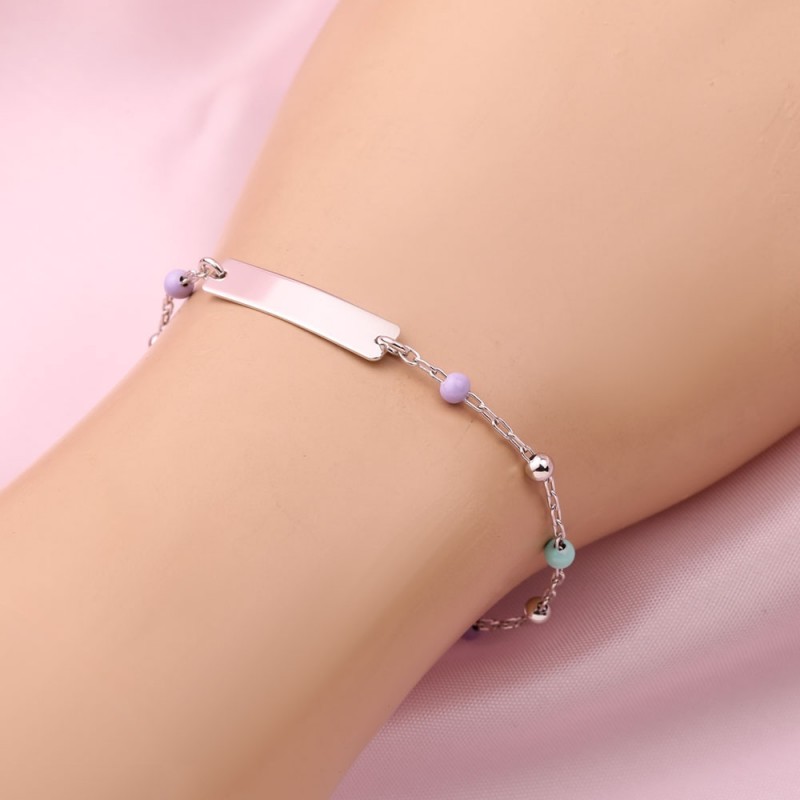 Kinderarmband aus 925er Silber mit Platte zum Gravieren eines Namens oder Geburtsdatums, verziert mit Silberkugeln und Emaille.Ankerkette