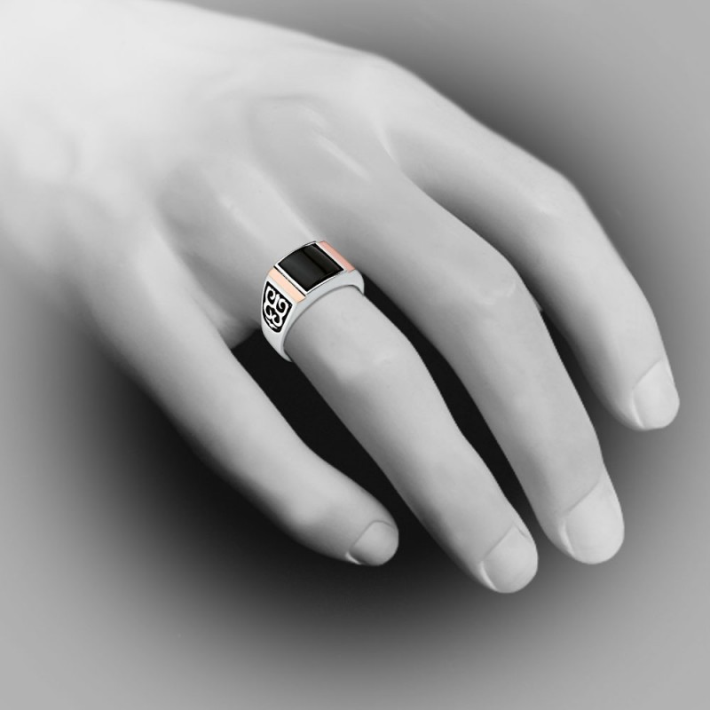 Herren Ring aus geschwärztem 925er Silber verziert mit großem Onyx, Gold und Reliefmuster, das durch die schwarze Emaille besonders hervorgehoben wird. Jeder Mann möchte seinen eigenen stilvollen Akzent haben, eine teure Sache, die den Status unterstreicht.