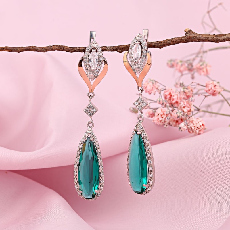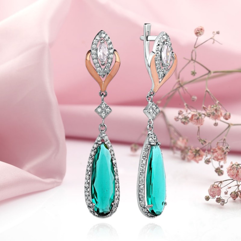 Шикарные серьги - подвески выполнены из серебра 925 пробы и золота 375 пробы, украшены очаровательными сверкающими фианитами! От таких серег так и веет шиком и неотразимостью. С ними Вы будете привлекательной в любом наряде!