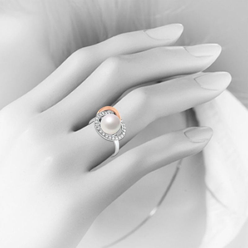 Ein herrlich zarter Ring mit bezaubernd funkelnden Zirkonias und einer natürlichen, Zuchtperle. Prägnant und stilvoll wirkt der Ring in einer wunderschönen Fassung aus rhodiniertem 925er Sterlingsilber und 375er Gold. Eine großartige Gelegenheit, sich selbst zu verwöhnen oder Ihrer Liebsten ein Geschenk zu machen, das die Zärtlichkeit, den Charme und die natürliche Schönheit ihrer Hände unterstreicht!