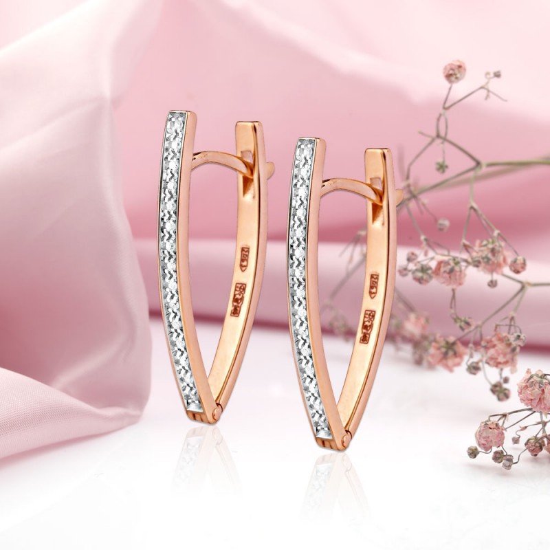 Изящные серьги из белого и красного золота 585 пробы со вставками очаровательных бриллиантов. Оправа камней из белого золота превосходно подчёркивает их красоту!