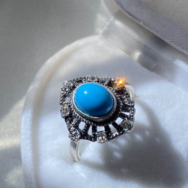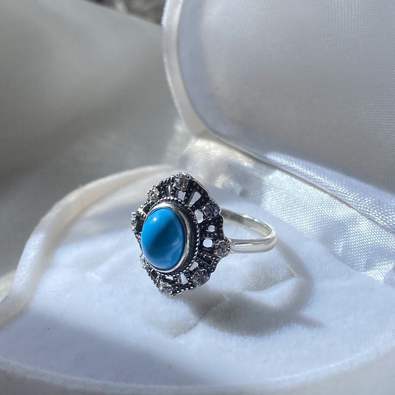Origineller Ring mit charmanten Türkis und funkelnden Zirkonia in einem schönen Silberrahmen aus 925er Silber, geschwärzt. Ein wunderbares Geschenk für Ihre Geliebte, das ihre einzigartige Schönheit betonen wird!