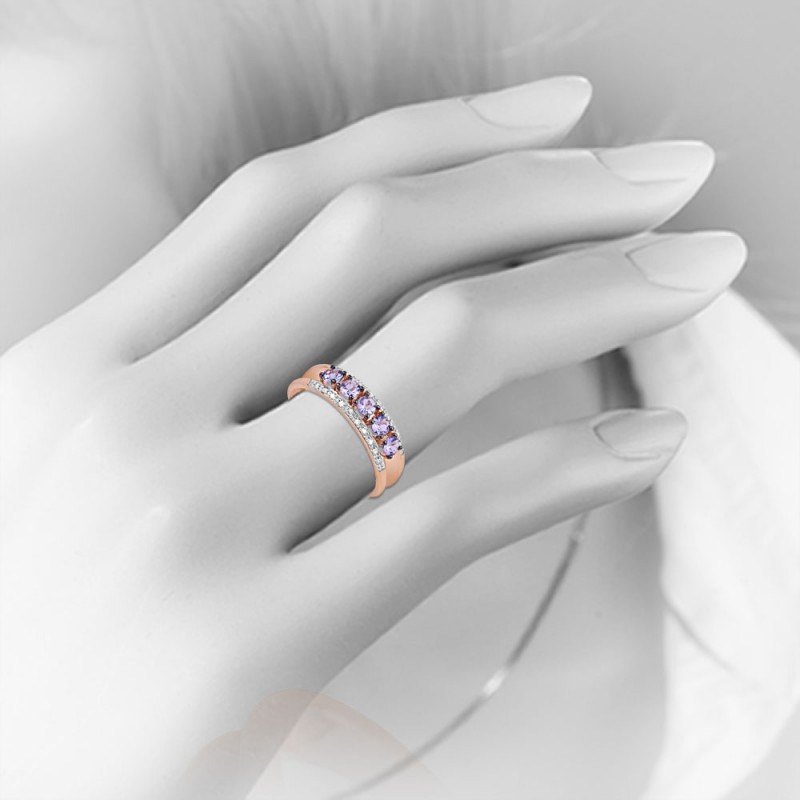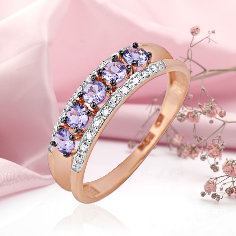 Zierlicher, zarter Goldring für schöne weibliche Finger! Ring aus 14-karätigem Rot- und Weißgold, besetzt mit funkelnden Diamanten und wunderschönen Tansanit. Weißgold unterstreicht auf besondere Weise die Schönheit von Diamanten. Natürlich träumt jede Frau von solch einem unvergesslichen und inspirierenden Geschenk!