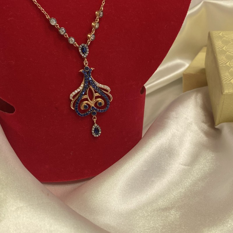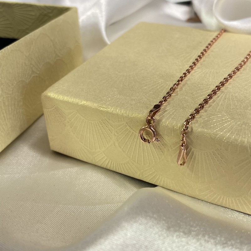 Eine elegante Halskette aus rotvergoldetem 925er Sterlingsilber mit dekorativem Einsatz, verziert mit farbigen Zirkonia auf geschwärztem Hintergrund! Das Kettengeflecht ist Anker. Diamantschliff!