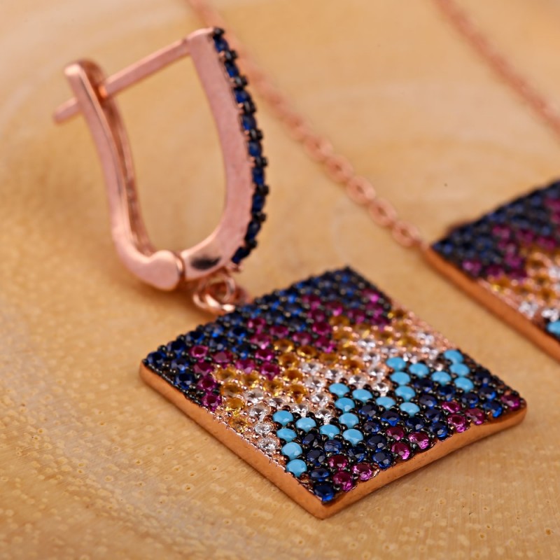 Ein entzückendes Set aus rotvergoldetem 925er Sterlingsilber mit Einsätzen aus funkelnden Zirkonia und Türkis! Die Kombination dieser bezaubernden Steine verleiht dem Produkt ein einzigartiges Aussehen und fesselt das Auge. Ein solches Set wird die Zärtlichkeit, Weiblichkeit und den Charme seiner Herrin unterstreichen!