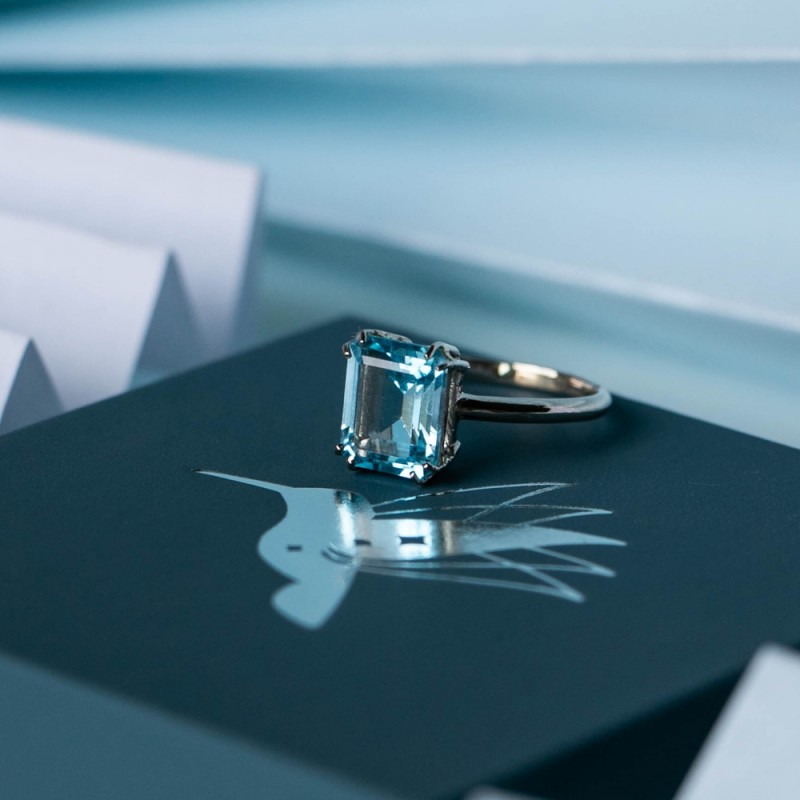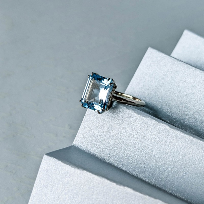 Ring aus Weißgold 585 mit blauen Topas. Eleganter Ring aus 14-karätigem Weißgold mit großem Topas-Oktagon-Einsatz. Ein wunderbares Geschenk aus Weißgold für einen lieben Menschen und eine Gelegenheit, Ihre Einzigartigkeit zu betonen!