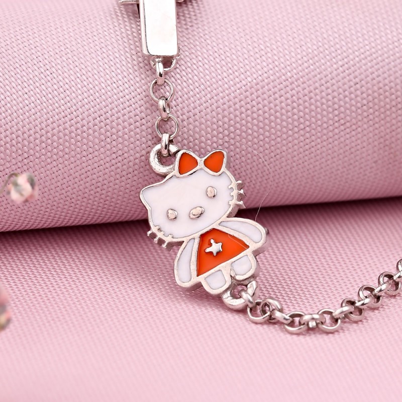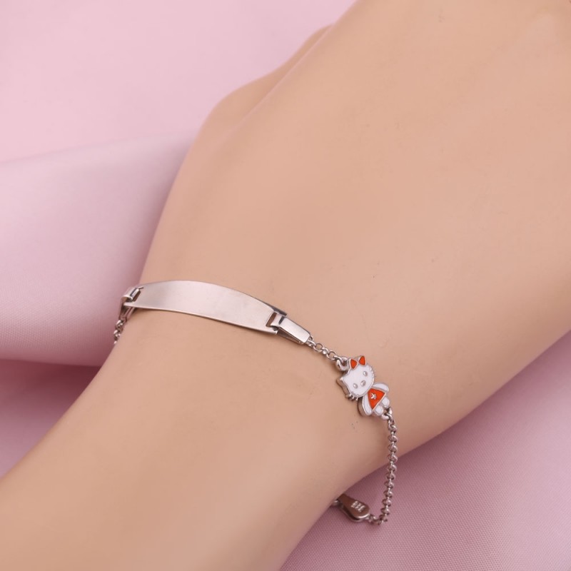 Kinderarmband aus 925er Silber mit Platte zum Gravieren eines Namens oder Geburtsdatums, verziert mit Katzenfigur aus Emaille. Ankerkette