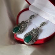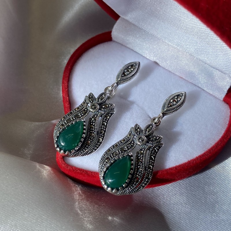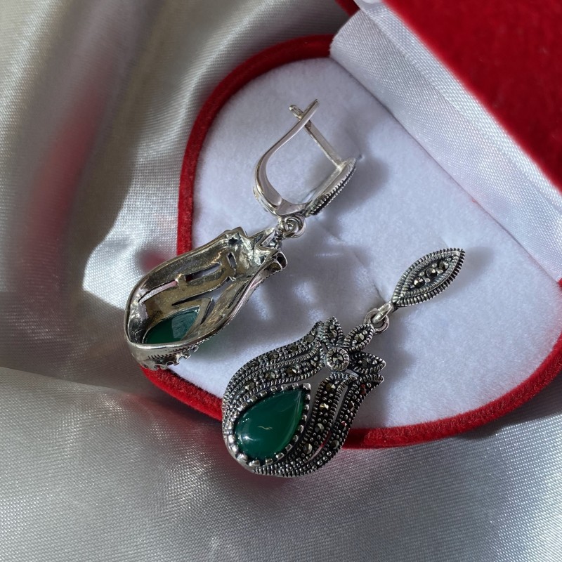 Schicke Ethno-Ohrhänger im osmanischen Stil, handgefertigt aus geschwärztem 925er Sterlingsilber mit einem großen Einsatz aus Chrysopras und tiefem Markasit! Die Ohrringe sind mit einem durchbrochenen Reliefmuster verziert, das den antiken Stil des Produkts unterstreicht.