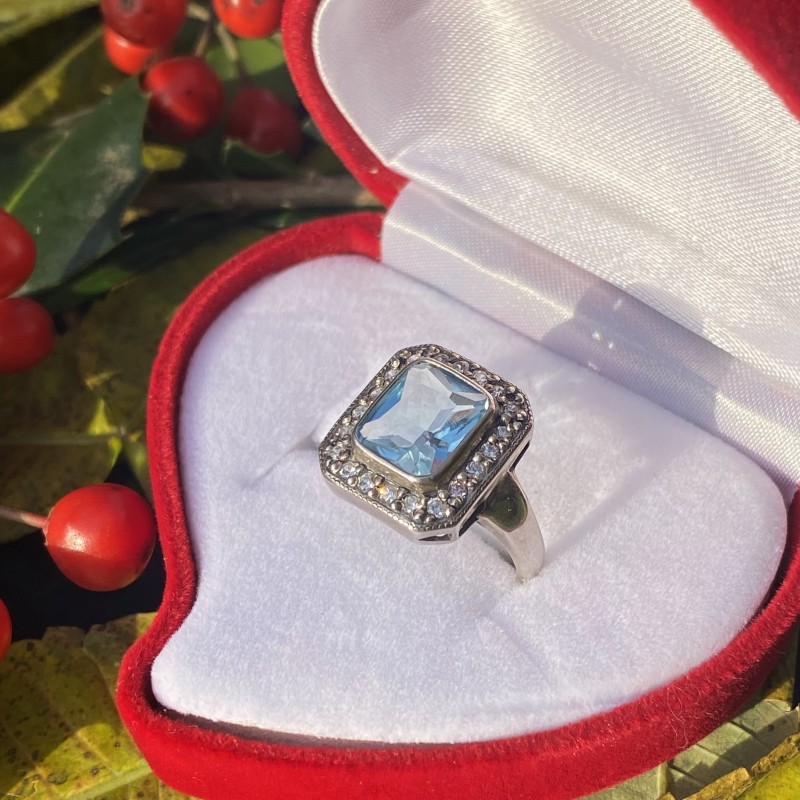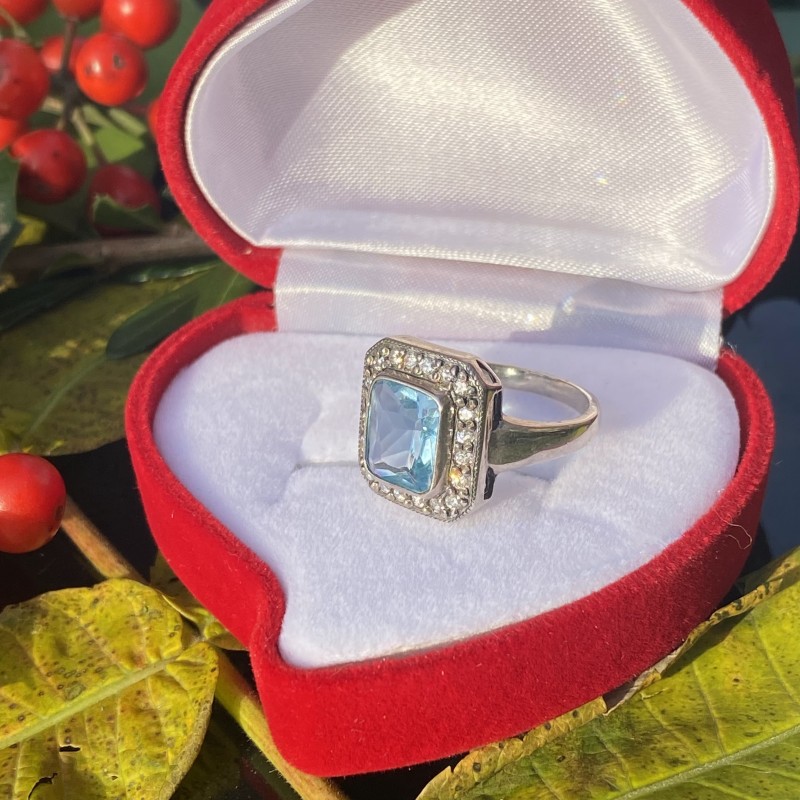 Herrlicher zarter Ring mit charmanten blauen Topas und funkelnden Zirkonia in einem schönen Silberrahmen aus geschwärztem 925er Silber. Diese Dekoration hat die Mission, ihrem Besitzer die hellsten und höchsten Gefühle zu vermitteln!