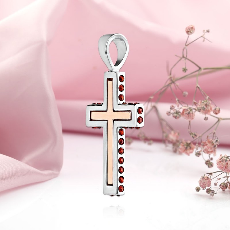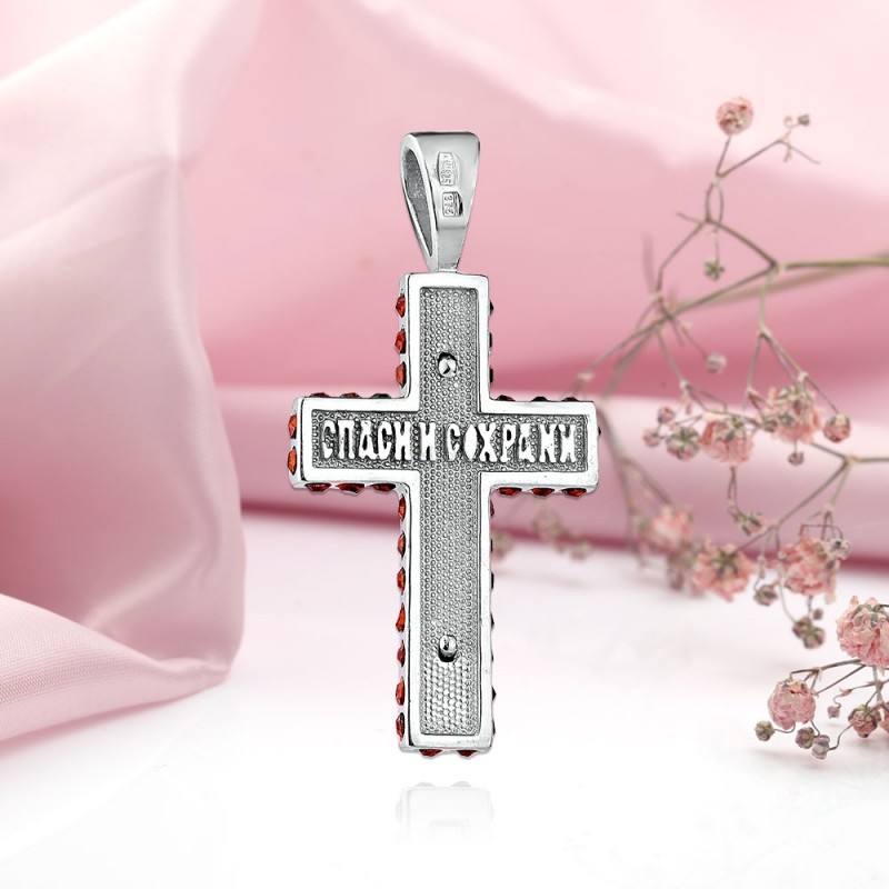 Kreuzanhaenger 925° aus 925°-Silber und 375°-Gold mit farbigen Swarovski®-Kristallen. Auf der Rückseite befindet sich eine Inschrift auf russish: "Rette und bewahre".