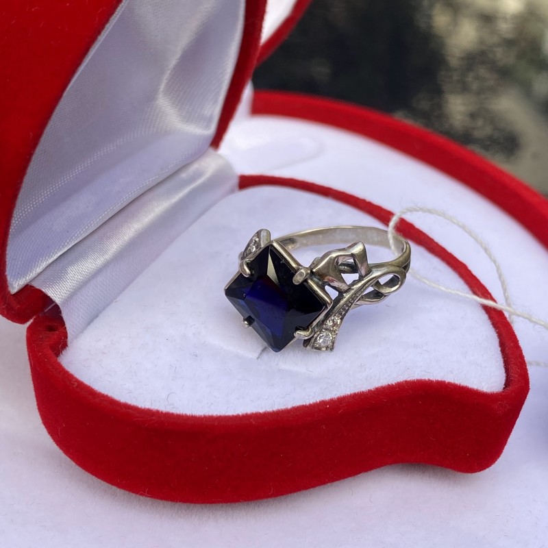 Ein herrlich zarter Ring mit einem bezaubernden Saphir und funkelnden Zirkonia. Der Ring wirkt lakonisch und stilvoll in einem wunderschönen Rahmen aus geschwärztem 925er Sterlingsilber.