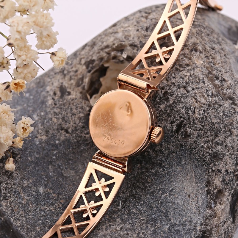Elegante goldene mechanische Uhr. Das Armband und das Gehäuse bestehen aus 585er Rot- und Weißgold mit Einsätzen aus bezaubernden Diamanten. Die „Chaika“-Uhr mit 17 Steinen ist zu einem Symbol für Qualität und einem stilvollen Accessoire geworden. Sie vereinen die Traditionen der Uhrenindustrie und modernes Design. Das Tragen einer solchen Uhr bedeutet, guten Geschmack und Liebe zum Detail zu beweisen.
