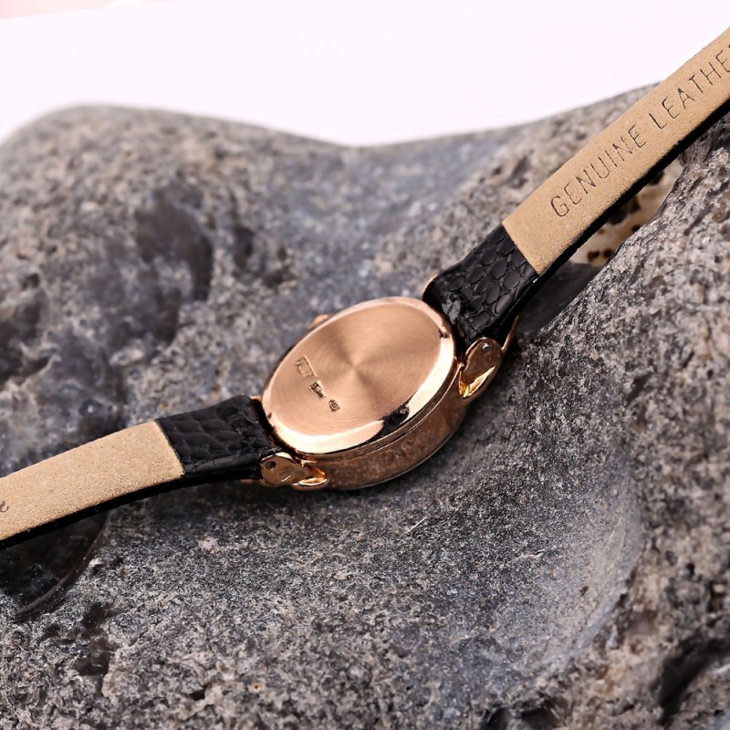 Feine Quarzuhr aus Gold. Das Armband besteht aus echtem Leder und das Gehäuse aus 585er