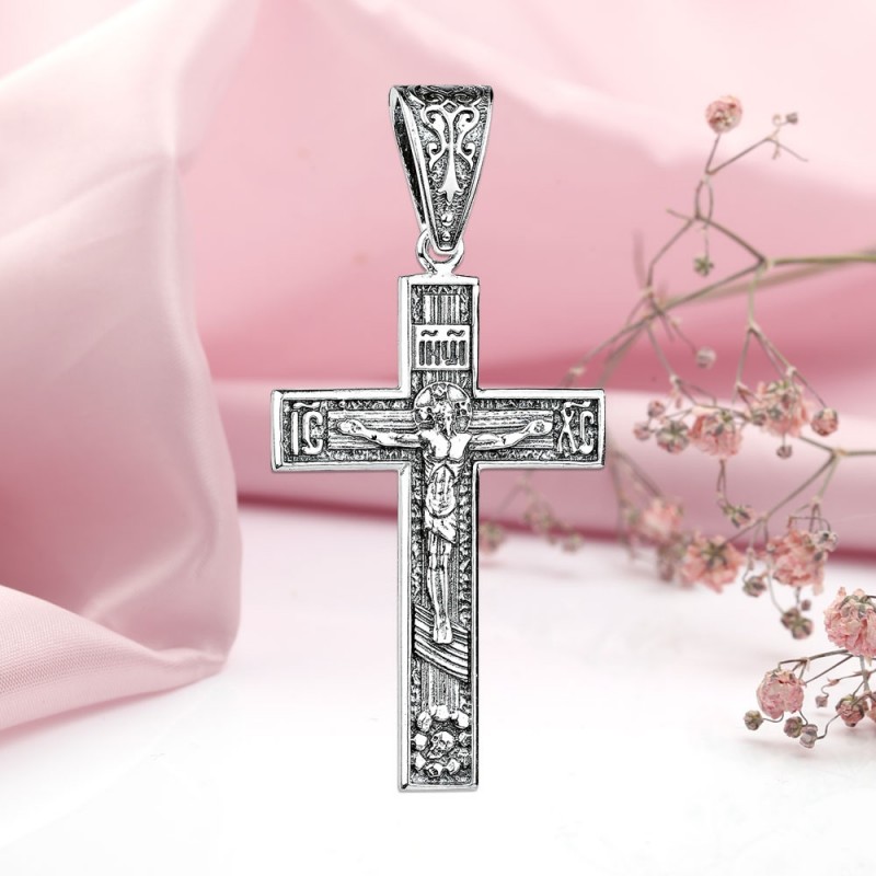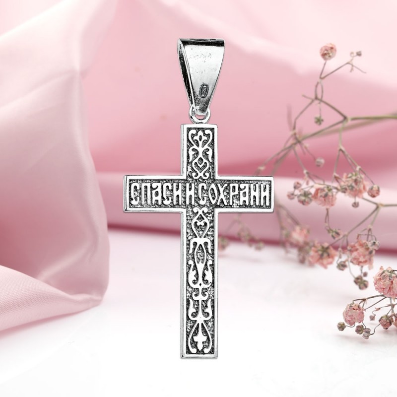 Silbernes Brustkreuz aus geschwärztem 925er Sterlingsilber! Auf der Rückseite befindet sich die Inschrift auf Russisch: „Rette und bewahre.“ Kratzt beim Tragen nicht.