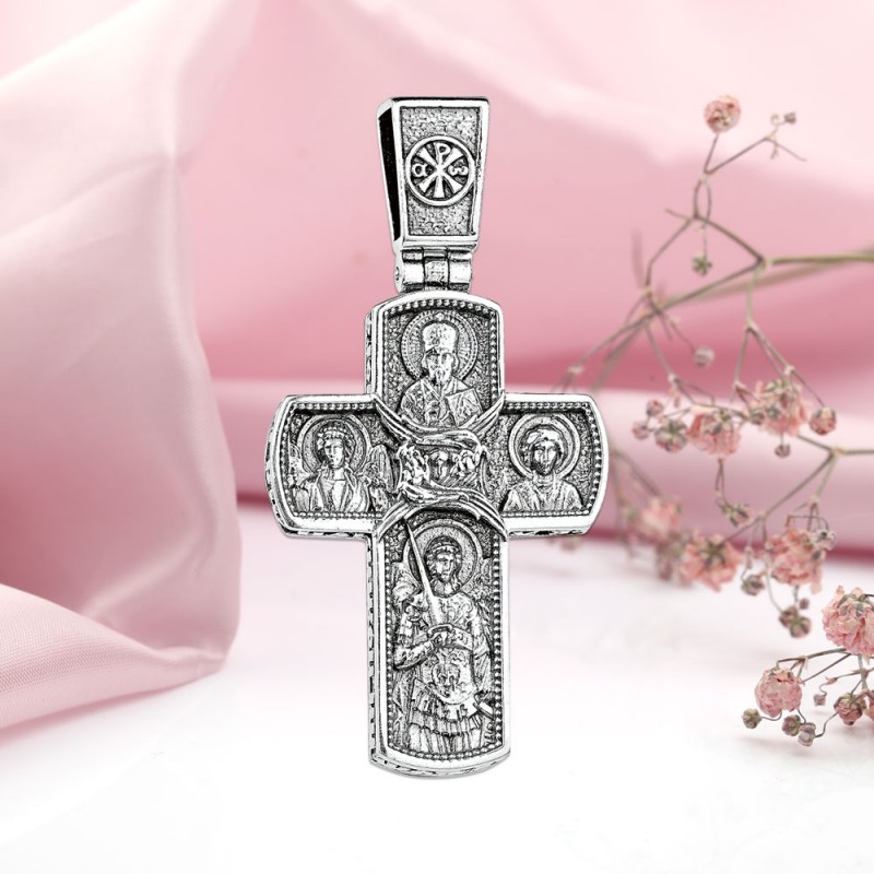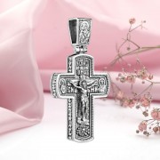 Серебряный крест нательный из чернёного серебра 925 пробы c рельефным рисунком! На боковoй стороне выгравированна надпись. Не царапается при ношении.
