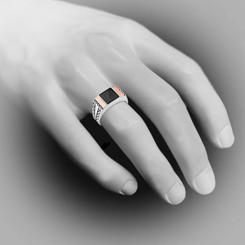Geschwärzter Herren-Siegelring aus 925er Sterlingsilber mit Rotgold-Akzenten. Einsatz: Onyx. Jeder Mann möchte seinen eigenen stilvollen Akzent haben, eine teure Sache, die seinen Status unterstreicht. Eine ausgezeichnete Wahl für alle, die ihrem Image mehr Solidität, Aussagekraft und Originalität verleihen möchten. Vervollständigen Sie Ihren Look und unterstreichen Sie Ihre Individualität mit nur einem originellen Accessoire und Sie werden nichts falsch machen.