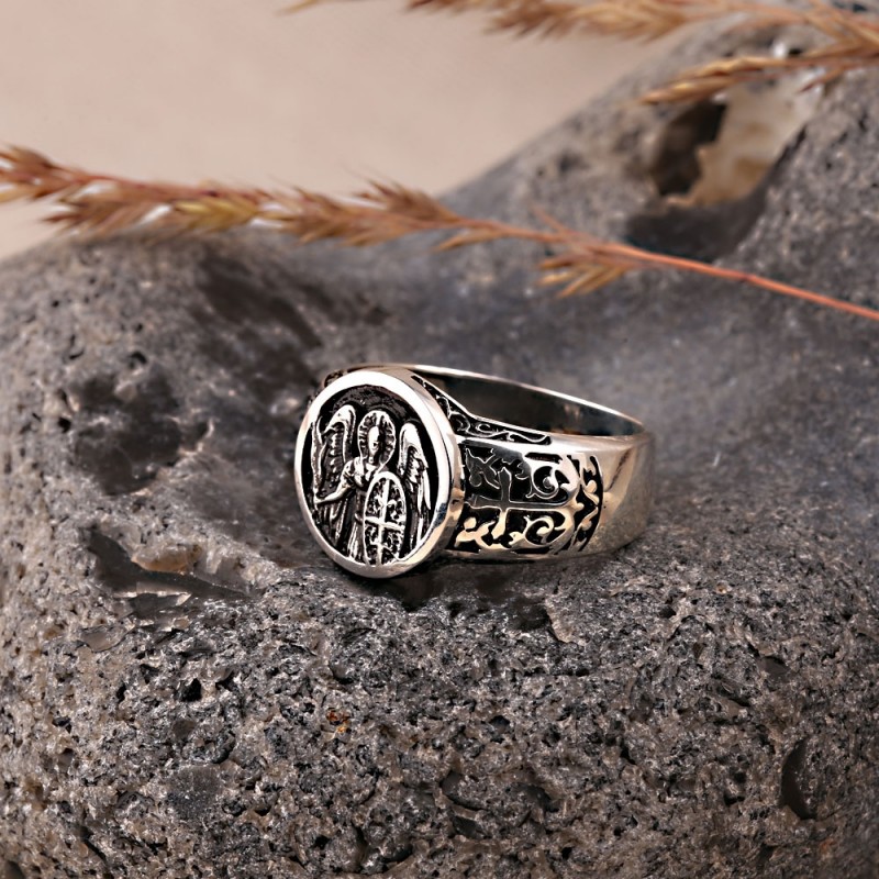 Amulettring aus geschwärztem 925er Sterlingsilber in ungewöhnlichem Design in der Technik der Schwärzung von Silber mit einem Reliefbild.