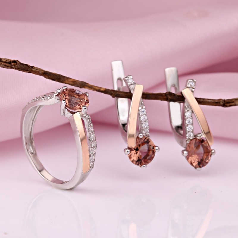 Ein bezauberndes Silberset mit rotgoldenen Akzenten, bestehend aus Ohrringen und einem Ring, mit Einsätzen aus einem unglaublich schönen Sultanit und bezaubernd funkelnden Zirkonia. 925er Sterlingsilber, 375er Gold. Eine wunderbare romantische Ergänzung für Ihren Look!