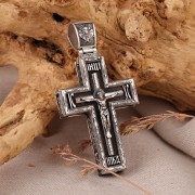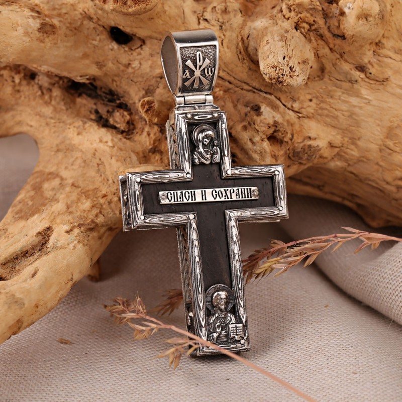 Серебряный нательный крест из эбенового дерева и чернёного серебра 925 пробы c с гальваническим покрытием и рельефным рисунком! Не царапается при ношении.