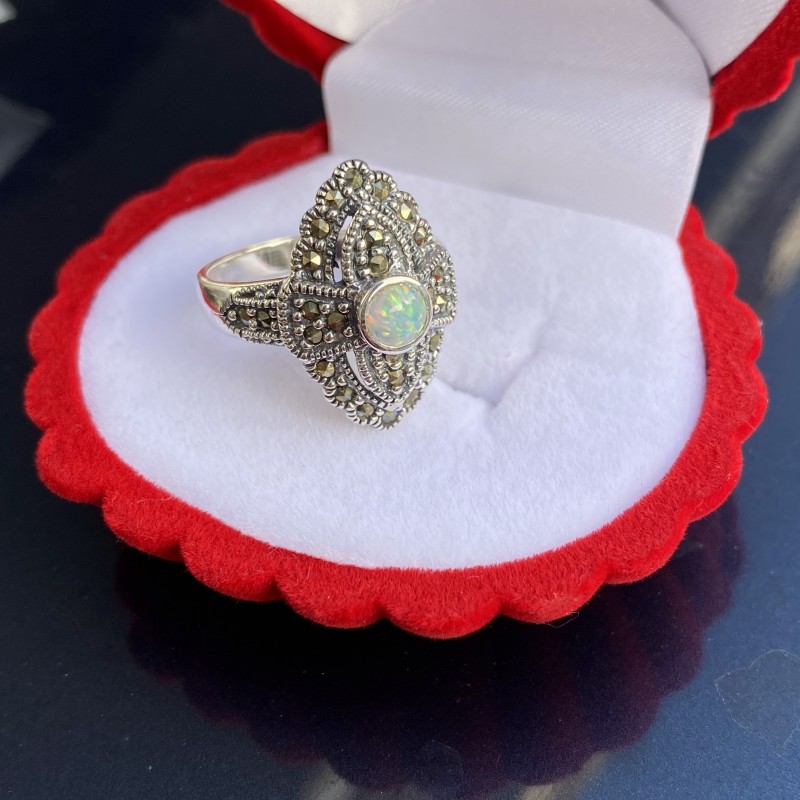 Wunderschöner Ring aus geschwärztem 925er Sterlingsilber mit bezaubernden Opal- und tiefen Markasit-Einsätzen. Ein solcher Ring wird die Verfeinerung des Geschmacks betonen und Ihnen das Gefühl geben, eine echte Königin zu sein.