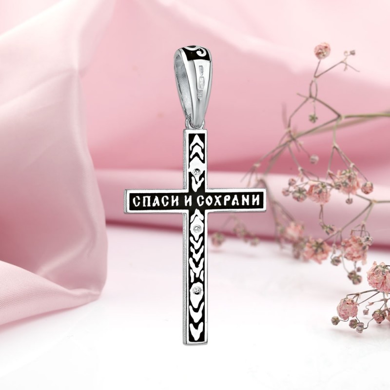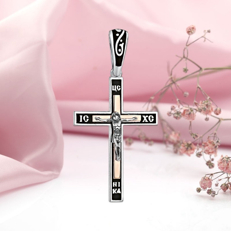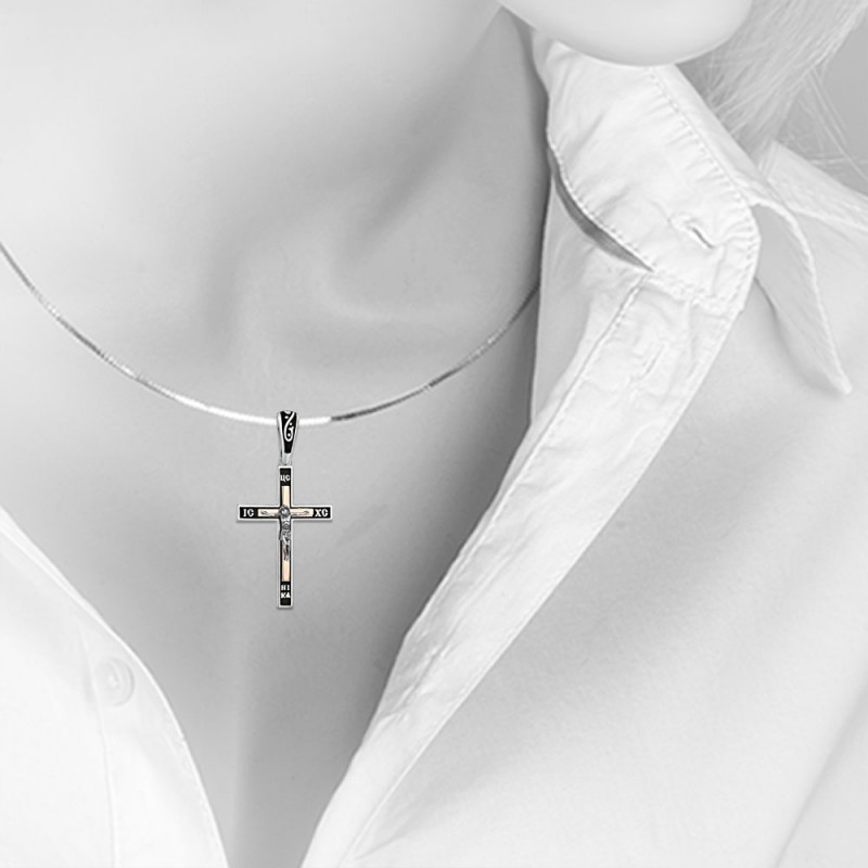Silbernes Brustkreuz mit einem Kruzifix aus Gold und 925er Sterlingsilber, eingefasst in schwarzer Emaille! Die Inschrift auf der Rückseite: „Rette und bewahre“ auf schwarzem Emailgrund. Kratzt nicht beim Tragen.