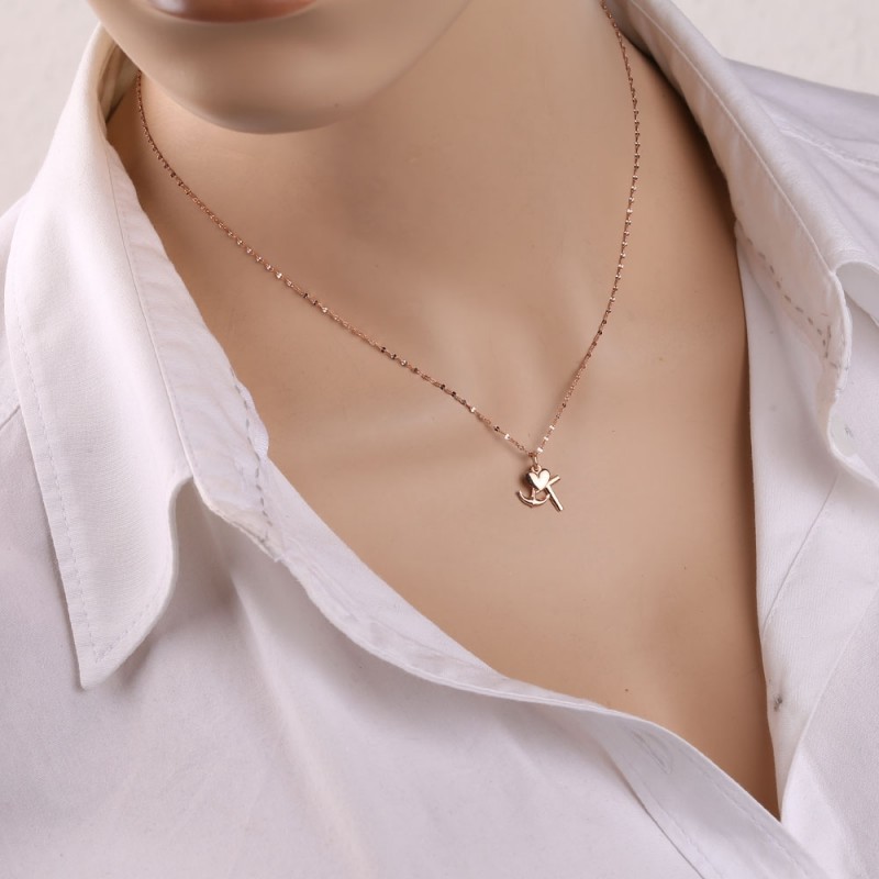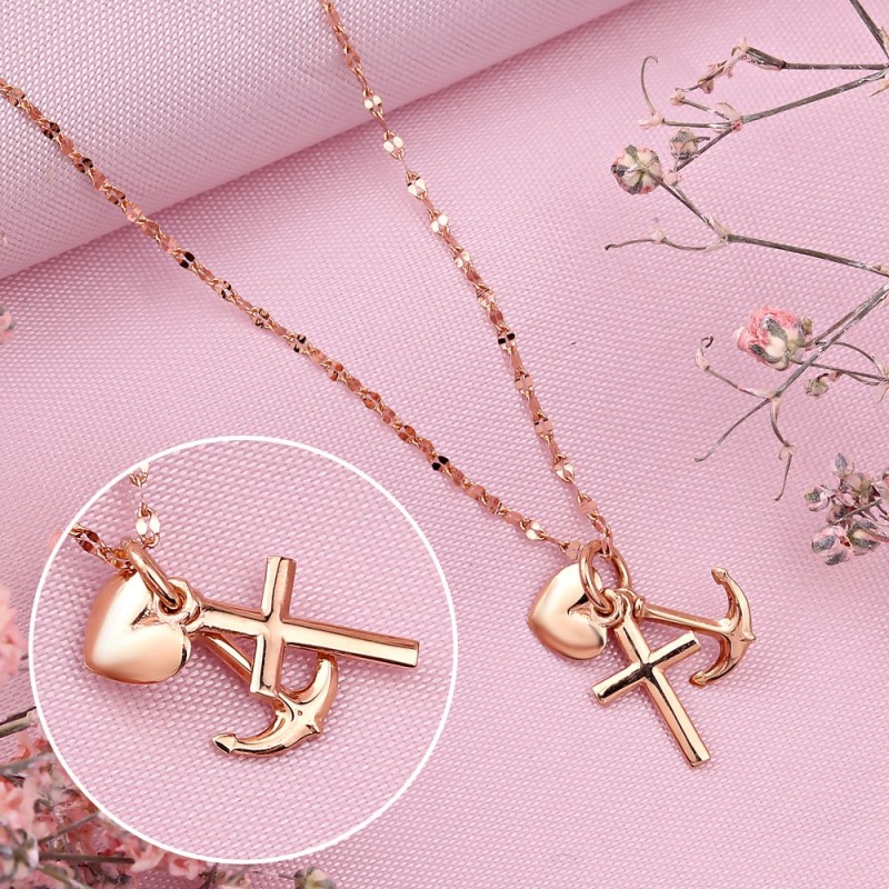 Rotgold, verziert mit einem Anhänger aus Herz, Anker und Kreuz mit Spiegeloberfläche. Die Kette ist ein ausgefallenes Ankergeflecht mit Diamantschliff.