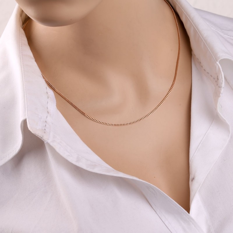 Rotgold mit Diamantschliff. Goldketten schaffen den nötigen Akzent im Bild und lenken die Aufmerksamkeit auf den Reichtum und Luxus von Accessoires, denn Gold ist schön, stilvoll, schick und teuer.