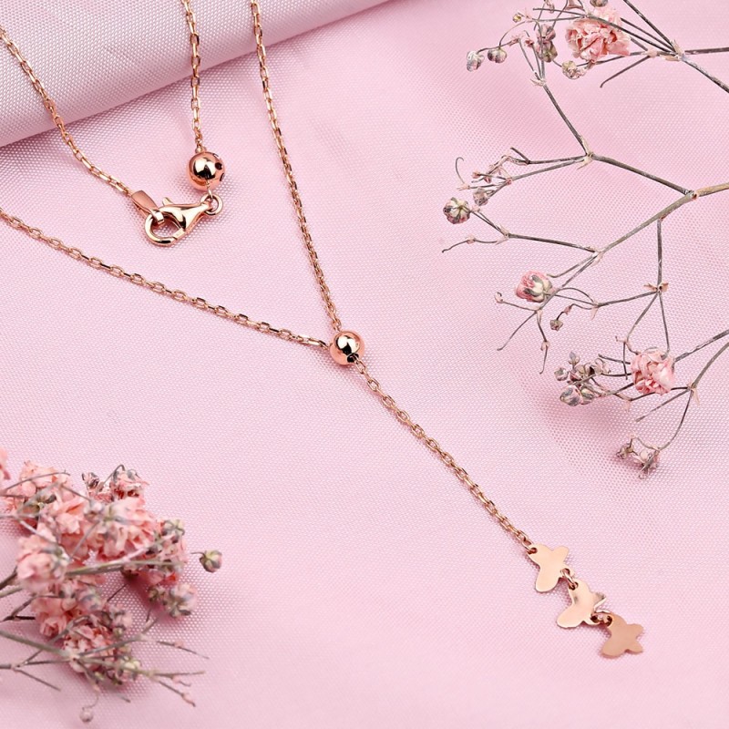 Нежное и романтичное колье из красного золота 585 пробы с оригинальной, модной конструкцией подвески - затяжки. Цепь - якорное плетение с алмазной огранкой.