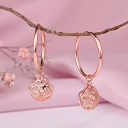 Schicke, modische Kongo-Ohrringe aus vergoldetem 925er Sterlingsilber. Die Kreolen sind mit Anhängern in Form einer Rose mit Einsätzen aus funkelnden Zirkonia verziert! Die Anhänger werden entfernt und die Ohrringe werden zu Kreolen ohne Steine. Transformer-Kreolen ermöglichen es ihrem Besitzer, immer anders und einzigartig zu sein.