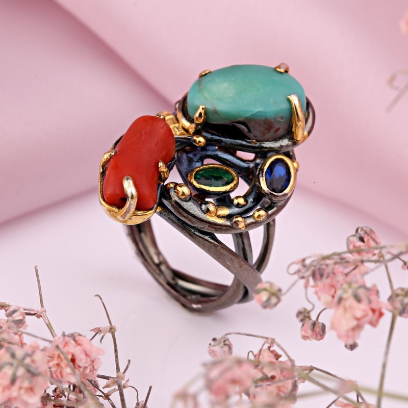 Ein bezaubernder Ring aus geschwärztem 925er Silber mit massiver Gelbgoldbeschichtung, verziert mit wunderschönen großen Türkis, mehrfarbigen Zirkonia und Korallen. Durch gekonnt gesetzte Akzente mittels Vergoldung wirkt der Ring einzigartig schön. Eine hervorragende Ergänzung zu Ihrem Bild von Weiblichkeit und Romantik.