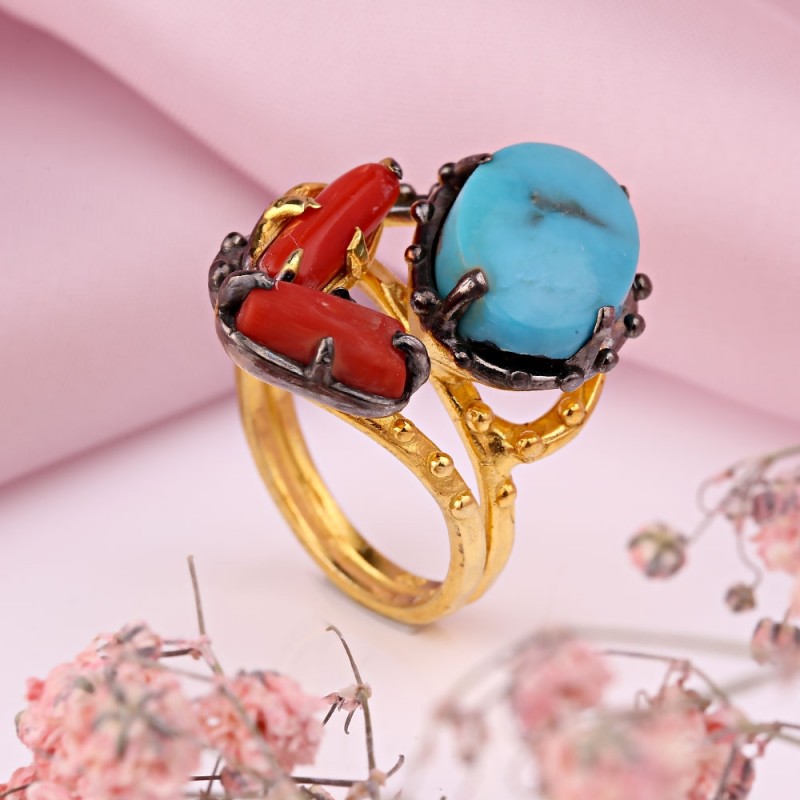 Ein bezaubernder Ring aus geschwärztem 925er Silber mit massiver Gelbgoldbeschichtung, verziert mit wunderschönen großen Türkis und Korallen. Durch gekonnt gesetzte Akzente mittels Vergoldung wirkt der Ring einzigartig schön. Eine hervorragende Ergänzung zu Ihrem Bild von Weiblichkeit und Romantik.