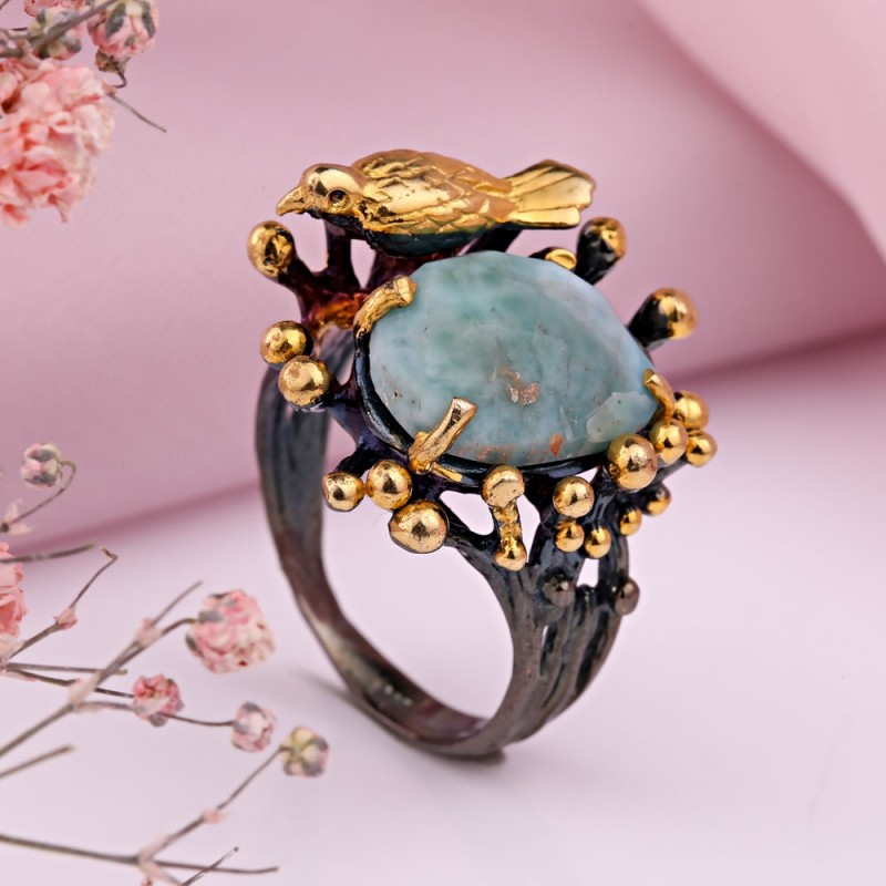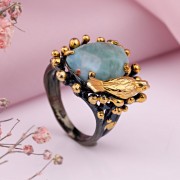 Ein bezaubernder Ring aus geschwärztem 925er Silber mit massiver Gelbgoldbeschichtung, verziert mit wunderschönen großen Türkis. Durch gekonnt gesetzte Akzente mittels Vergoldung wirkt der Ring einzigartig schön. Eine hervorragende Ergänzung zu Ihrem Bild von Weiblichkeit und Romantik.