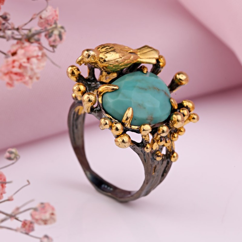 Ein bezaubernder Ring im osmanischen Stil aus geschwärztem 925er Silber mit massiver Gelbgoldbeschichtung, verziert mit wunderschönen großen Türkis. Durch gekonnt gesetzte Akzente mittels Vergoldung wirkt der Ring einzigartig schön. Eine hervorragende Ergänzung zu Ihrem Bild von Weiblichkeit und Romantik.