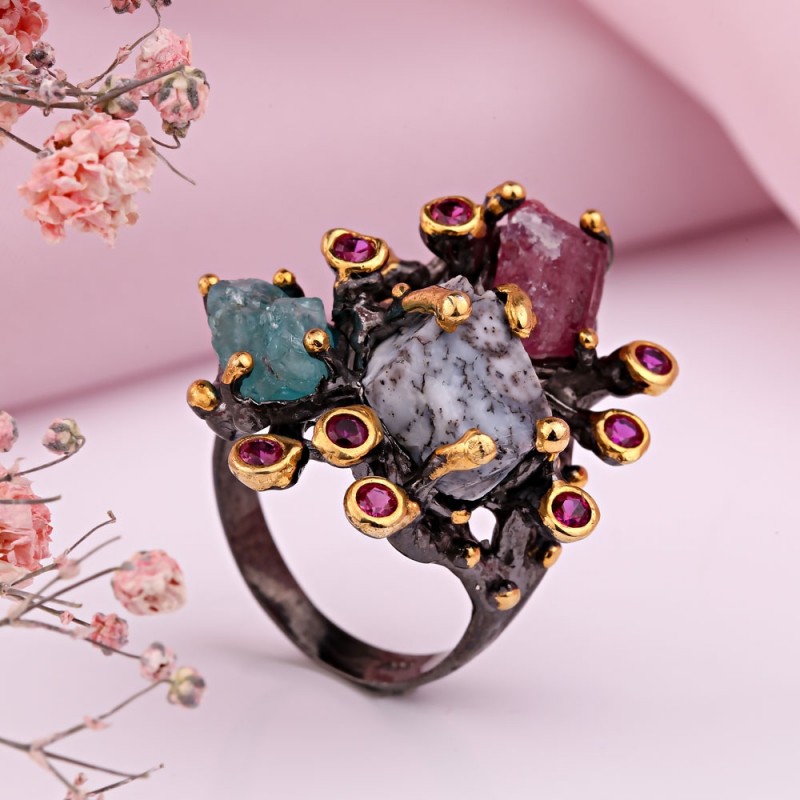 Ein bezaubernder Ring im osmanischen Stil aus geschwärztem 925er Silber mit massiver Gelbgoldbeschichtung, verziert mit wunderschönen Steinen natürlicher Form: Aquamarim, Rubin, Howlith, Zirkonia. Durch gekonnt gesetzte Akzente mittels Vergoldung wirkt der Ring einzigartig schön. Eine hervorragende Ergänzung zu Ihrem Bild von Weiblichkeit und Romantik.