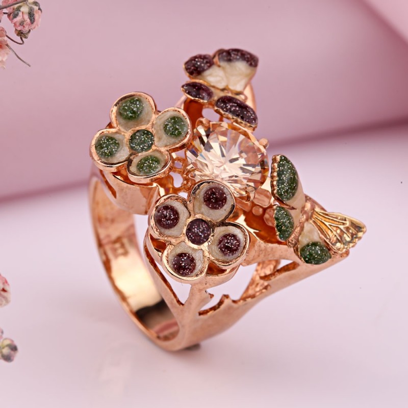Ein bezaubernder Ring aus 925er Sterlingsilber mit massiver Rotgoldbeschichtung, verziert mit wunderschönem großen Citrin und mehrfarbiger Emaille. Eine hervorragende Ergänzung zu Ihrem Bild von Weiblichkeit und Romantik.