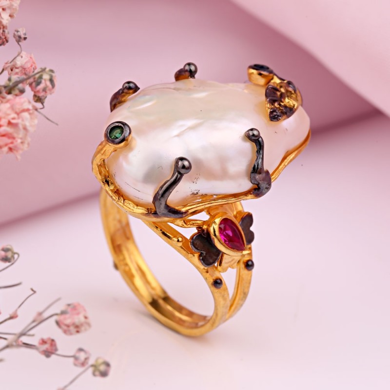 Ein bezaubernder Ring aus 925er Silber mit massiver Gelbgoldbeschichtung, verziert mit wunderschönen großen Barockperlen und mehrfarbigen Zirkonia. Durch gekonnt gesetzte Akzente mittels Schwärzung wirkt der Ring einzigartig schön. Eine hervorragende Ergänzung zu Ihrem Bild von Weiblichkeit und Romantik.