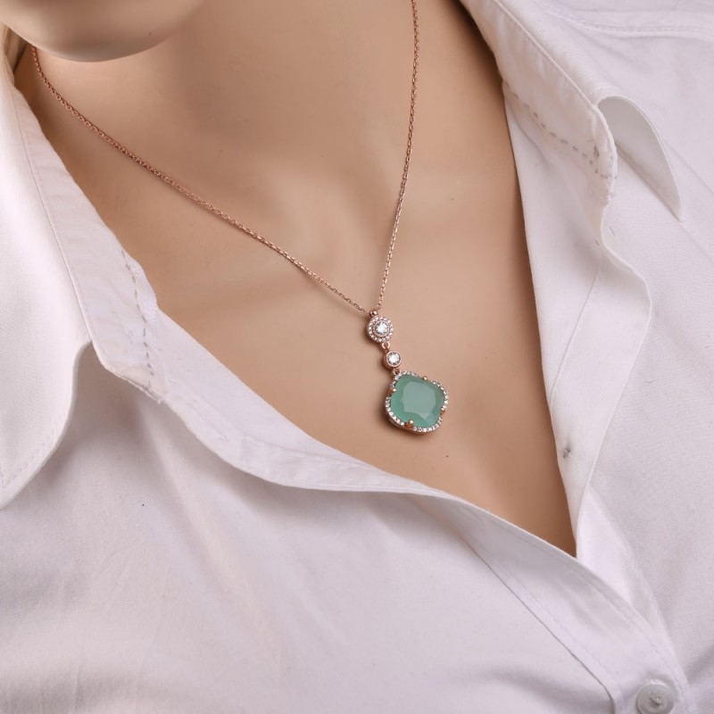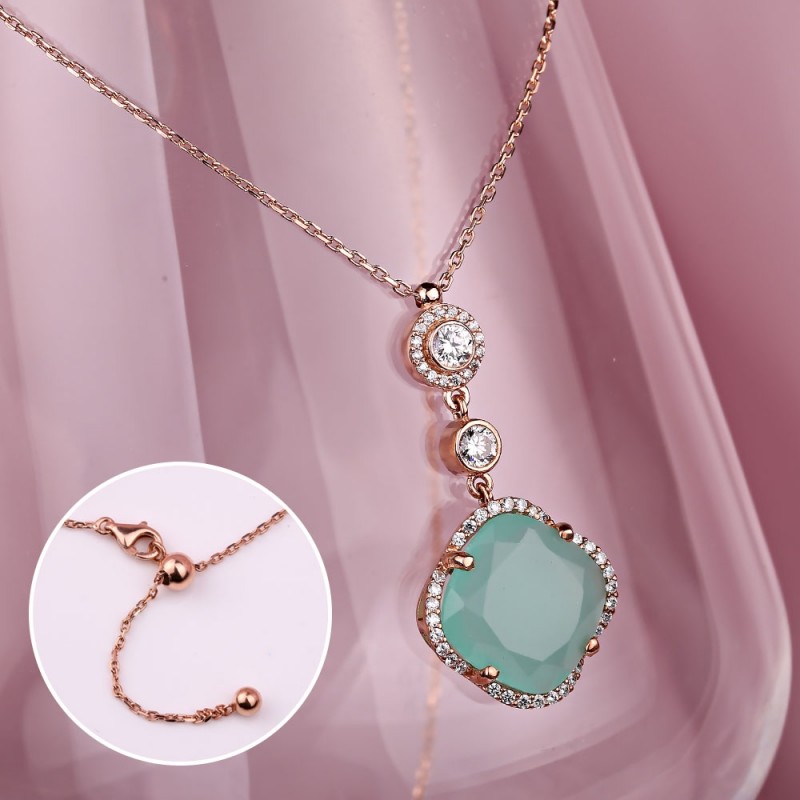 Eine entzückende, zarte Halskette mit bezaubernden Zirkonia-Steinen und wunderschönen Chrysopras in einem wunderschönen Rahmen aus vergoldetem 925er Sterlingsilber mit originellem, modischem Anhängerdesign mit Zugmechanismus. Eine großartige Gelegenheit, sich selbst zu verwöhnen oder Ihrer Liebsten ein Geschenk zu machen, das die Zärtlichkeit, den Charme und ihre natürliche Schönheit unterstreicht! Ankerkettengeflecht mit Diamantschliff.