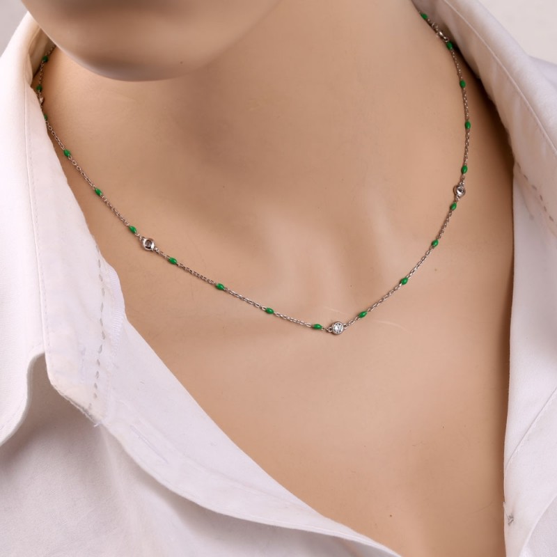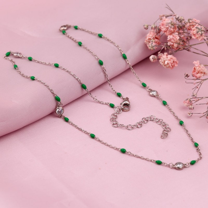 Halskette aus 925er Sterlingsilber verziert mit dekorativem Einsatz aus funkelnden Zirkonia und grüner Emaille! Kettenweberei - Anker, Diamantverarbeitung. Wunderbare Betonung Ihrer Zärtlichkeit und Unwiderstehlichkeit.