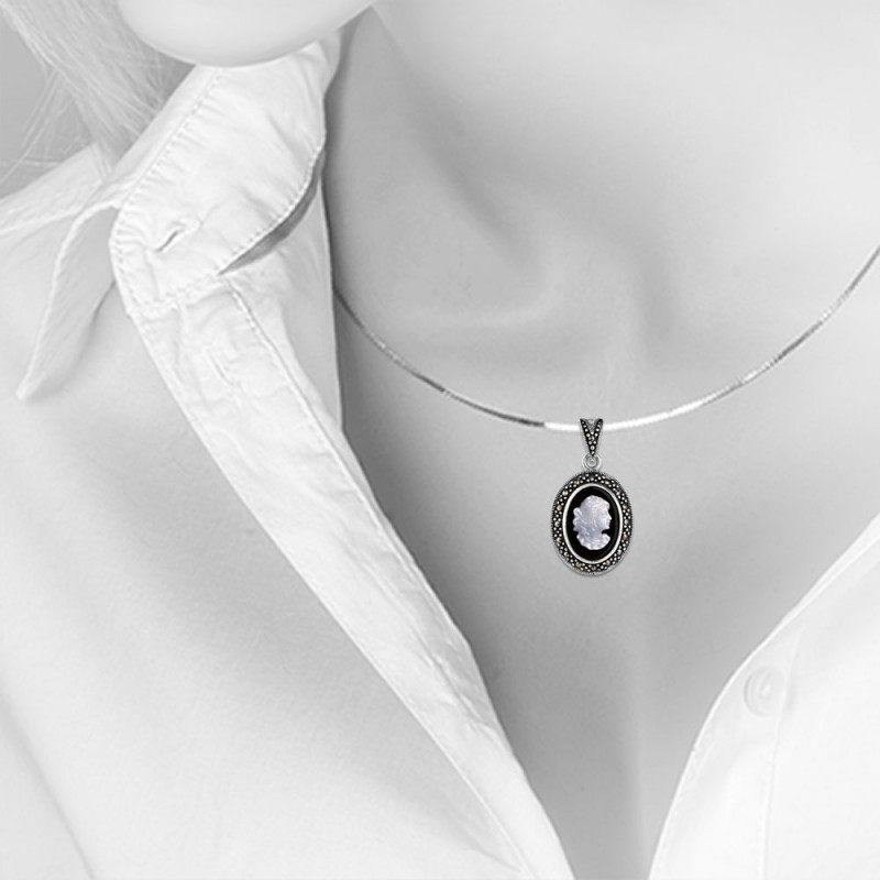 Ein schicker Anhänger im Antik-Stil aus geschwärztem 925er Sterlingsilber mit großem Perlmutteinsatz auf einem Hintergrund aus schwarzem Onyx und geheimnisvollen Markasiten!
