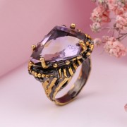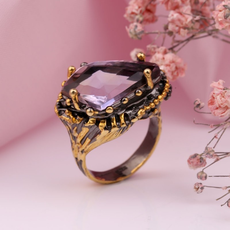 Ein bezaubernder Ring aus geschwärztem 925er Silber mit massiver Gelbgoldbeschichtung, verziert mit wunderschönen großen Amethyst. Durch gekonnt gesetzte Akzente mittels Vergoldung wirkt der Ring einzigartig schön. Eine hervorragende Ergänzung zu Ihrem Bild von Weiblichkeit und Romantik.
