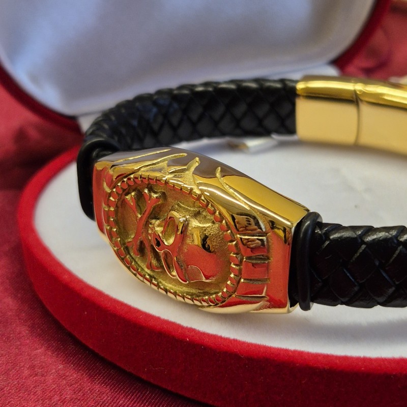 Stilvolles Lederarmband. Das Schloss und der dekorative Teil des Armbands bestehen aus Edelstahl mit einer verschleißfesten Beschichtung. Schmuck aus 316L-Schmuckstahl rostet nicht, oxidiert nicht und ist absolut gesundheitlich unbedenklich! Das Armband sieht stilvoll und interessant aus! Die Kombination aus schwarzem Leder und goldener Farbe verleiht dem Produkt einen besonderen Charme.