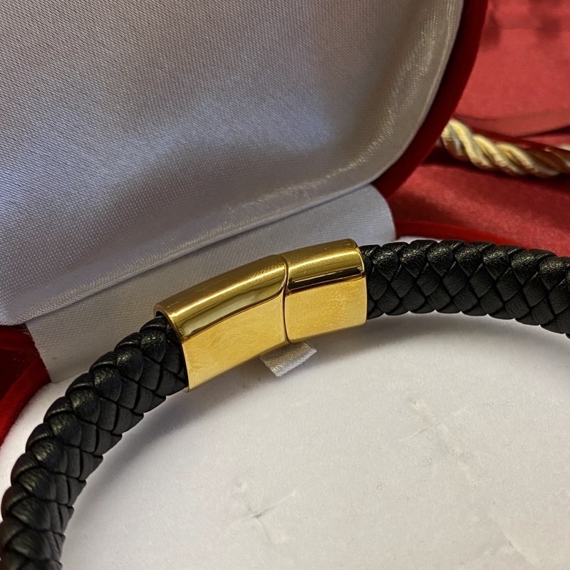 Stilvolles Lederarmband. Das Schloss und der dekorative Teil des Armbands bestehen aus Edelstahl mit einer verschleißfesten Beschichtung. Schmuck aus 316L-Schmuckstahl rostet nicht, oxidiert nicht und ist absolut gesundheitlich unbedenklich! Das Armband sieht stilvoll und interessant aus! Die Kombination aus schwarzem Leder und goldener Farbe verleiht dem Produkt einen besonderen Charme.