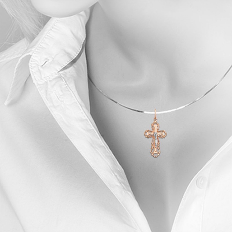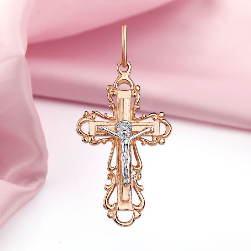 Goldenes Kreuzanhänger mit einem Kruzifix aus 585er Weiß/Rotgold. An der Spitze des Kreuzes befindet sich ein Ring für eine Schnur oder Kette. Kratzt nicht beim Tragen.